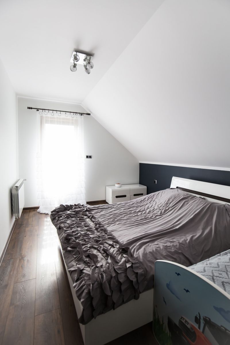 Na 155 m² całkowitej powierzchni (135 m² użytkowej) zaprojektowano przestrzeń, która odpowiada potrzebom rodziny: na parterze znajduje się jasna strefa dzienna z wyjściem na taras i ogród, kuchnia, toaleta oraz pomieszczenia gospodarcze, natomiast piętro mieści sypialnie i komfortową łazienkę.