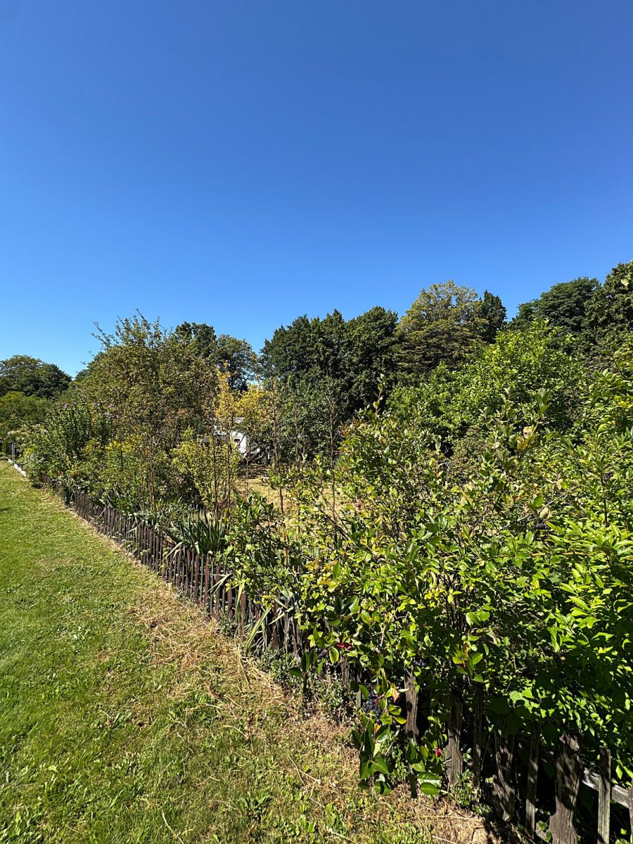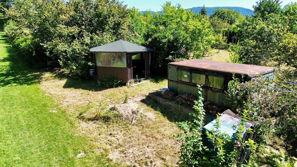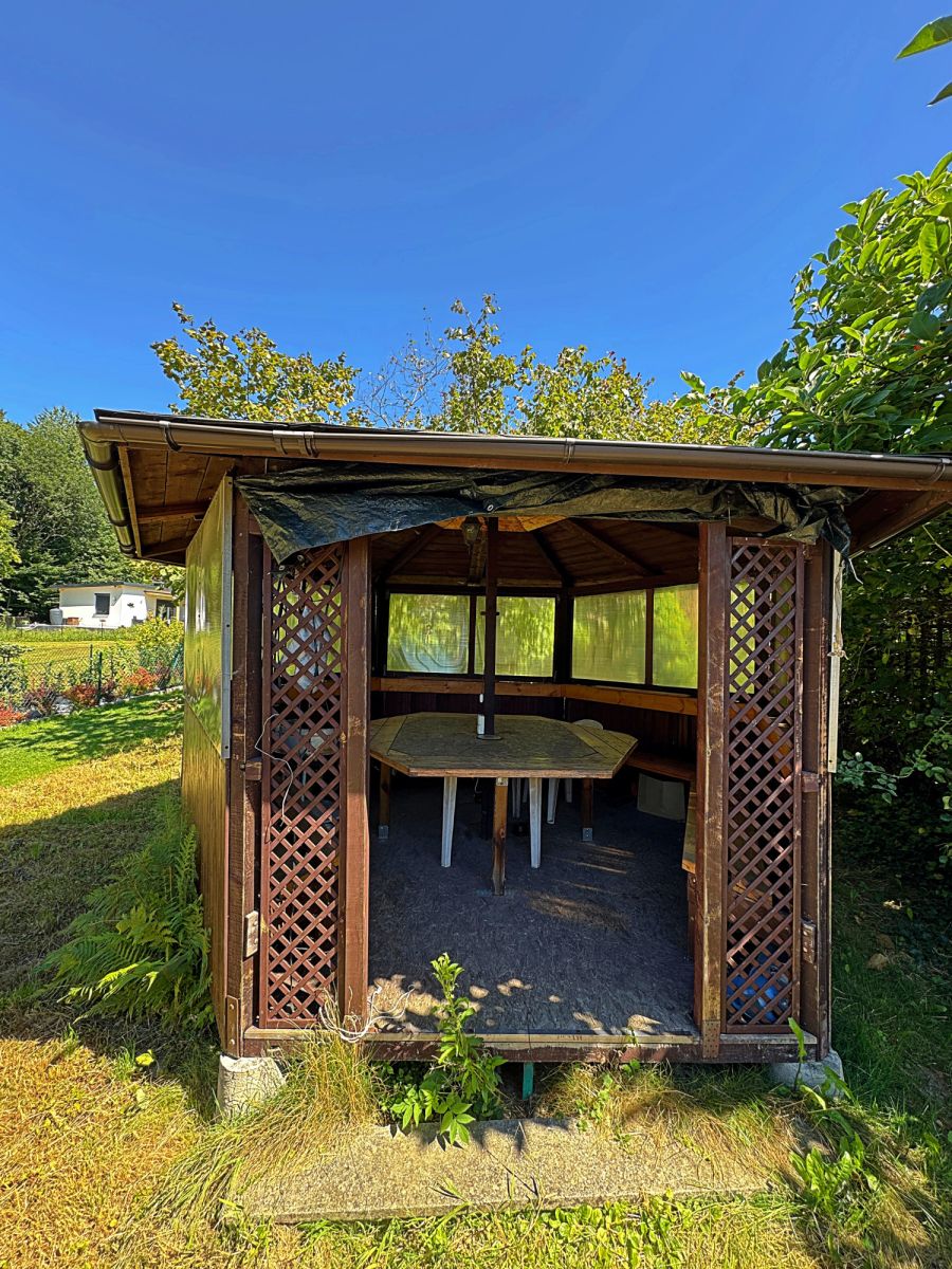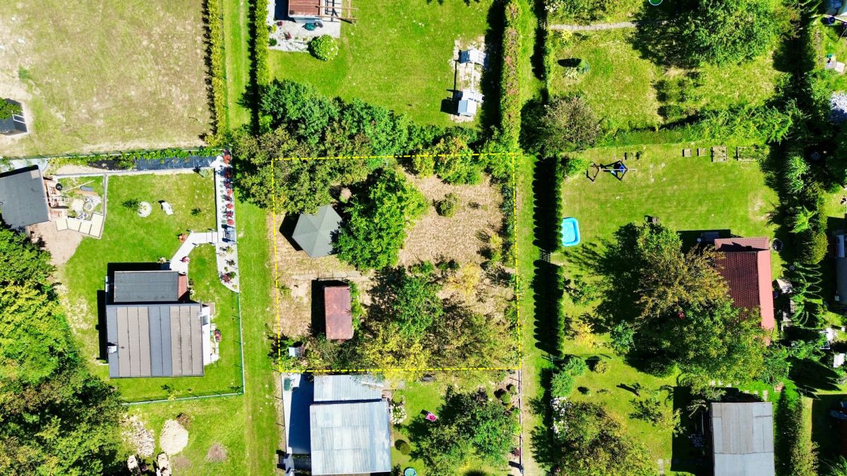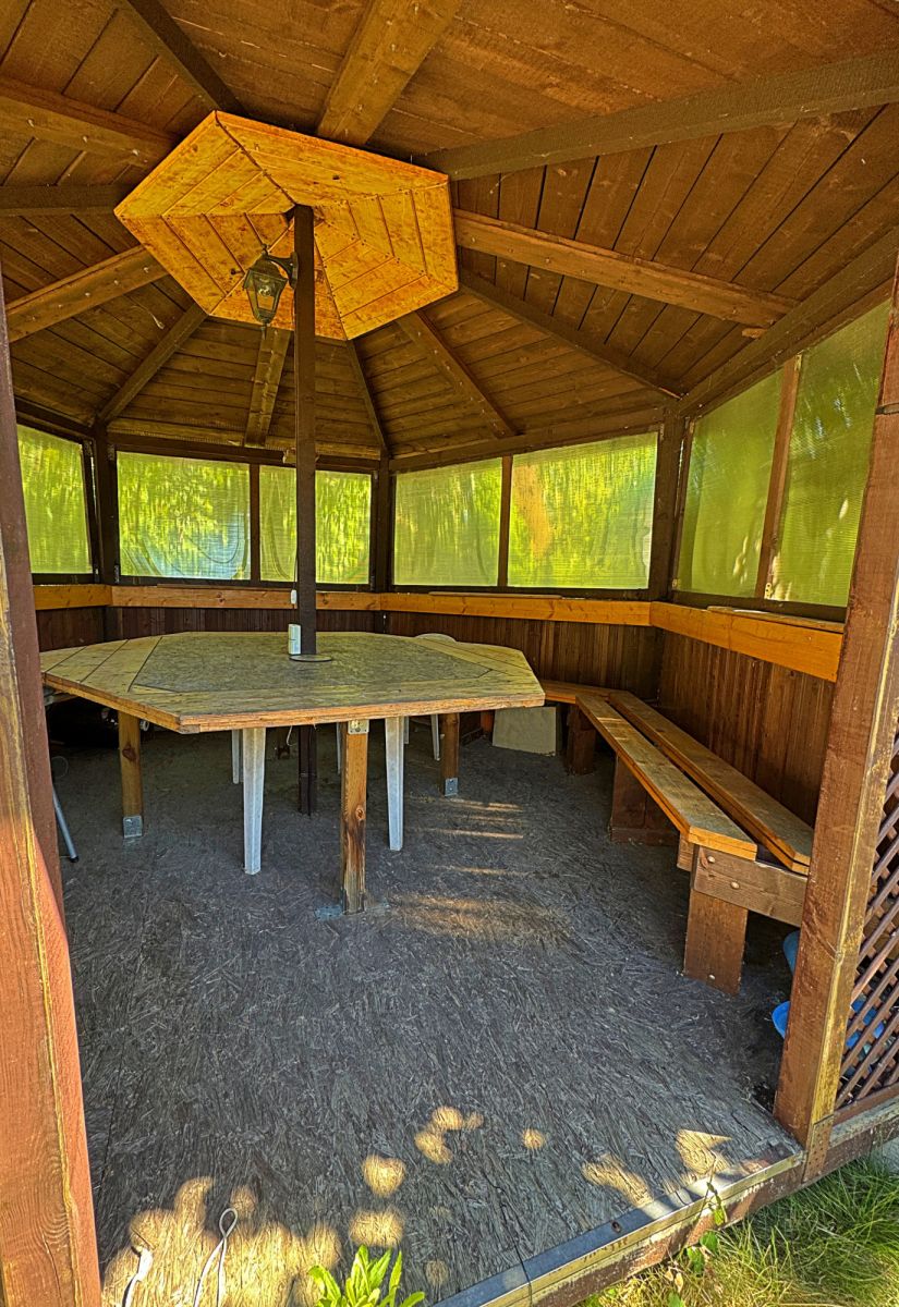 Do dyspozycji nowych właścicieli jest drewniana altana ogrodowa - przestronna, z zabudowanymi ściankami i oknami, co daje poczucie prywatności i osłony od wiatru. Wewnątrz mieści się duży stół oraz ławki, które tworzą wygodne miejsce do spotkań w gronie rodziny czy znajomych. To idealne miejsce na letnie posiłki, odpoczynek w cieniu lub wieczorne rozmowy przy świecach. Dodatkowym elementem działki jest kontener - istnieje możliwość jego usunięcia lub pozostawienia według preferencji nowego właściciela.
