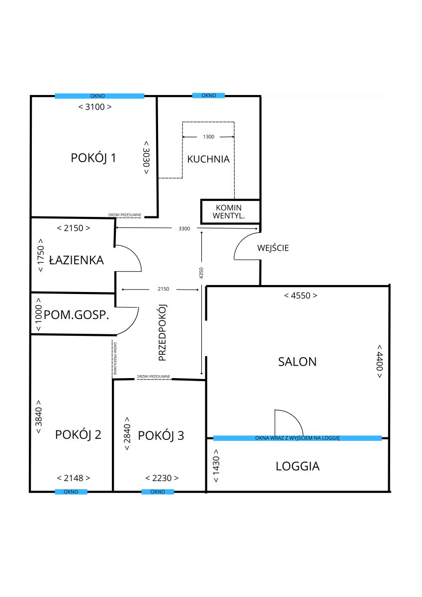 - jasny salon z wyjściem na dużą loggię (ok. 8 m²),