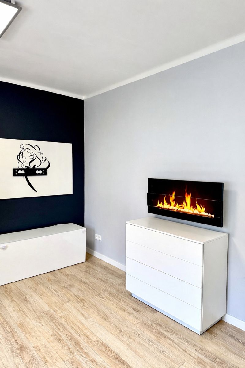 - salon wyposażony w kanapę typu L, szafkę RTV, miejsce pod telewizor oraz klimatyczny biokominek
