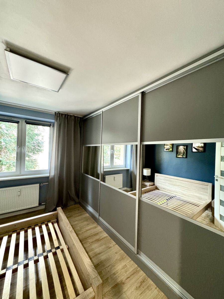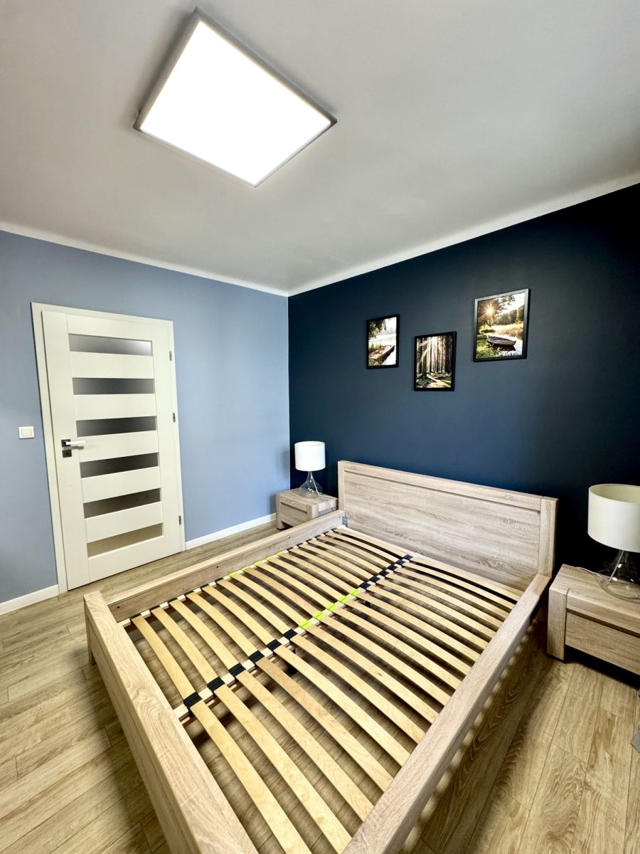 - sypialnię z łóżkiem ze stelażem oraz dużą szafą w zabudowie