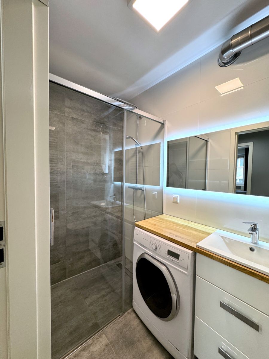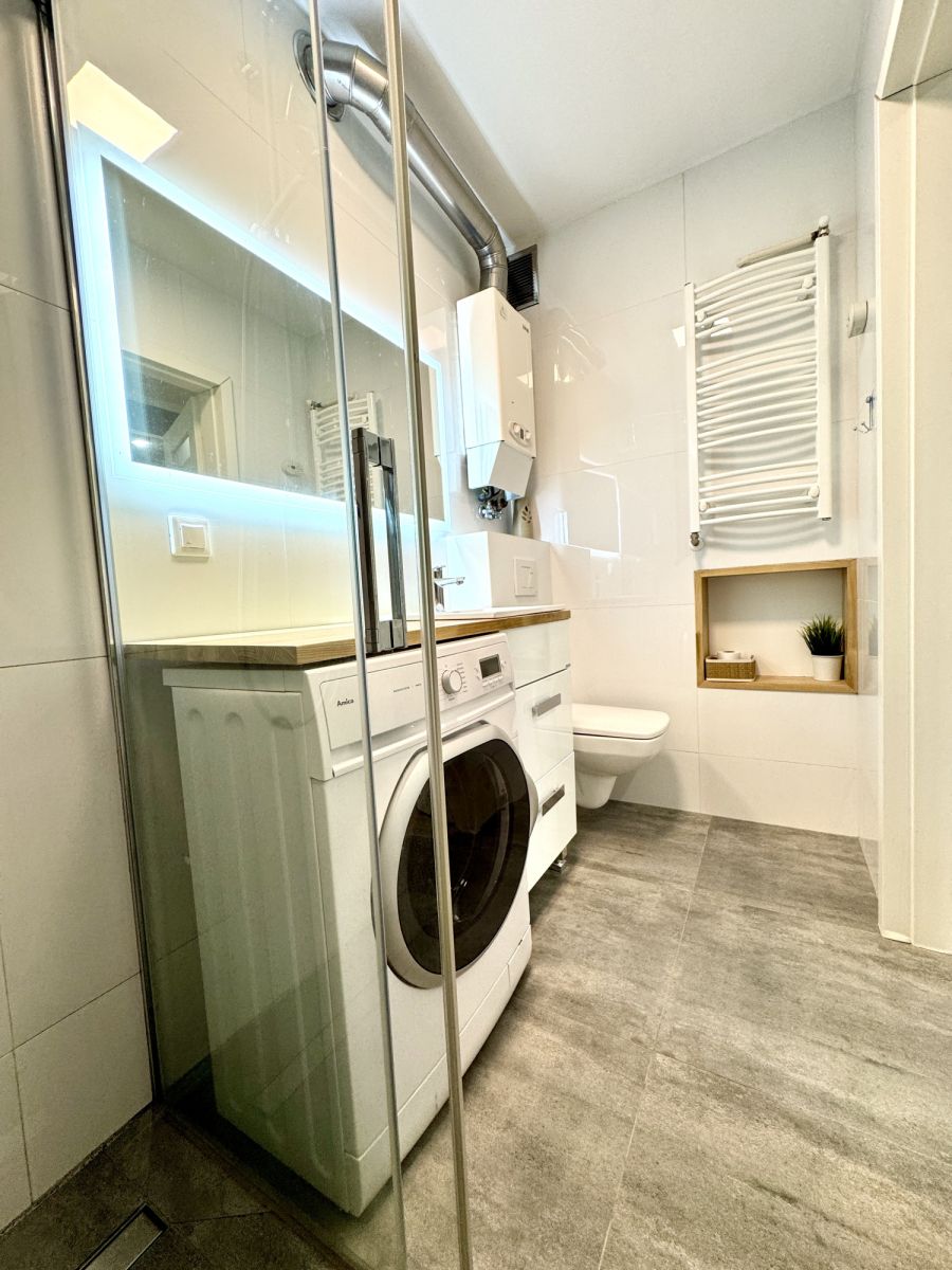 - łazienkę z kabiną prysznicową typu walk-in oraz pralką