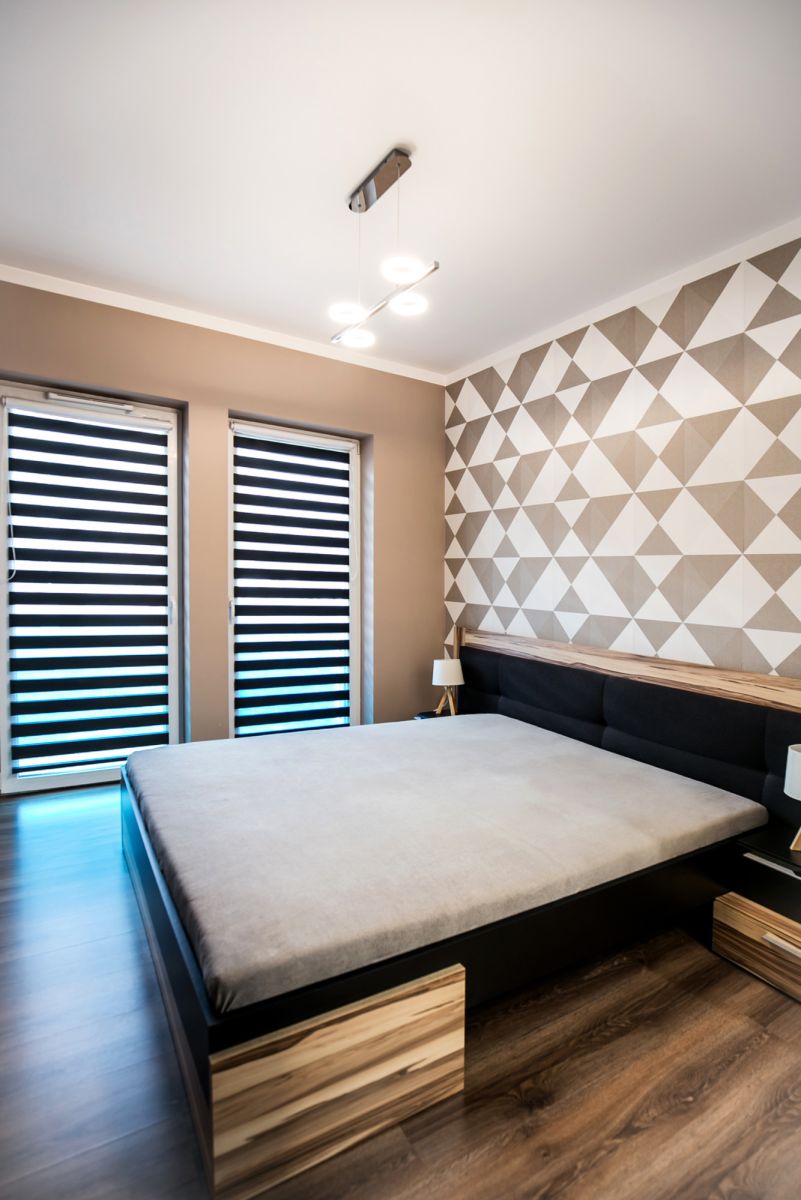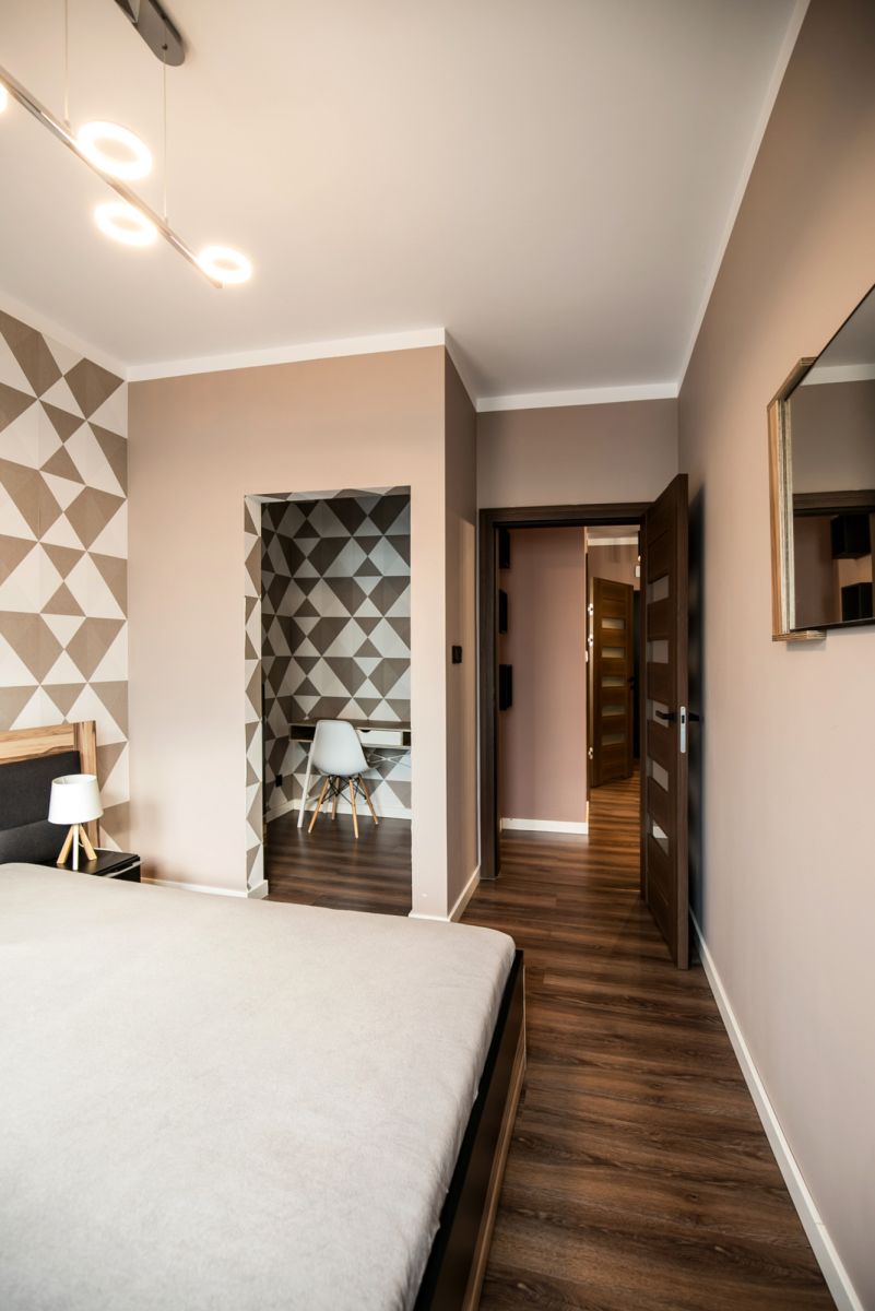 - sypialnia z łóżkiem małżeńskim, szafkami nocnymi, komodą oraz miejscem do pracy,