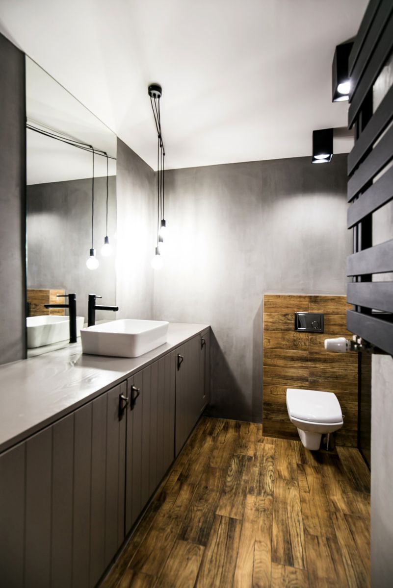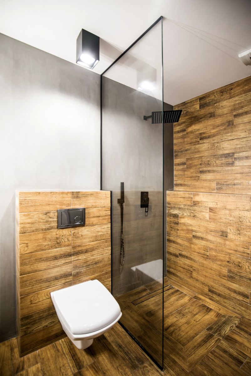 - łazienka z kabiną prysznicową typu walk-in, pralką w zabudowie i podgrzewanym lustrem,