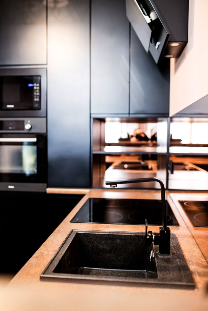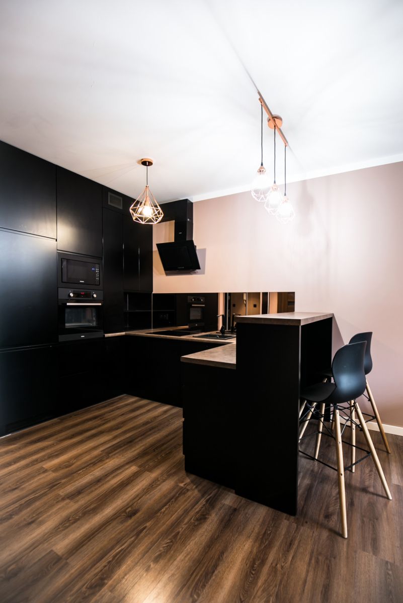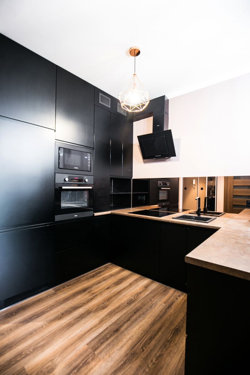 - kuchnia w zabudowie z wyspą oraz sprzętem AGD (lodówka, piekarnik, zmywarka, płyta indukcyjna, mikrofalówka),